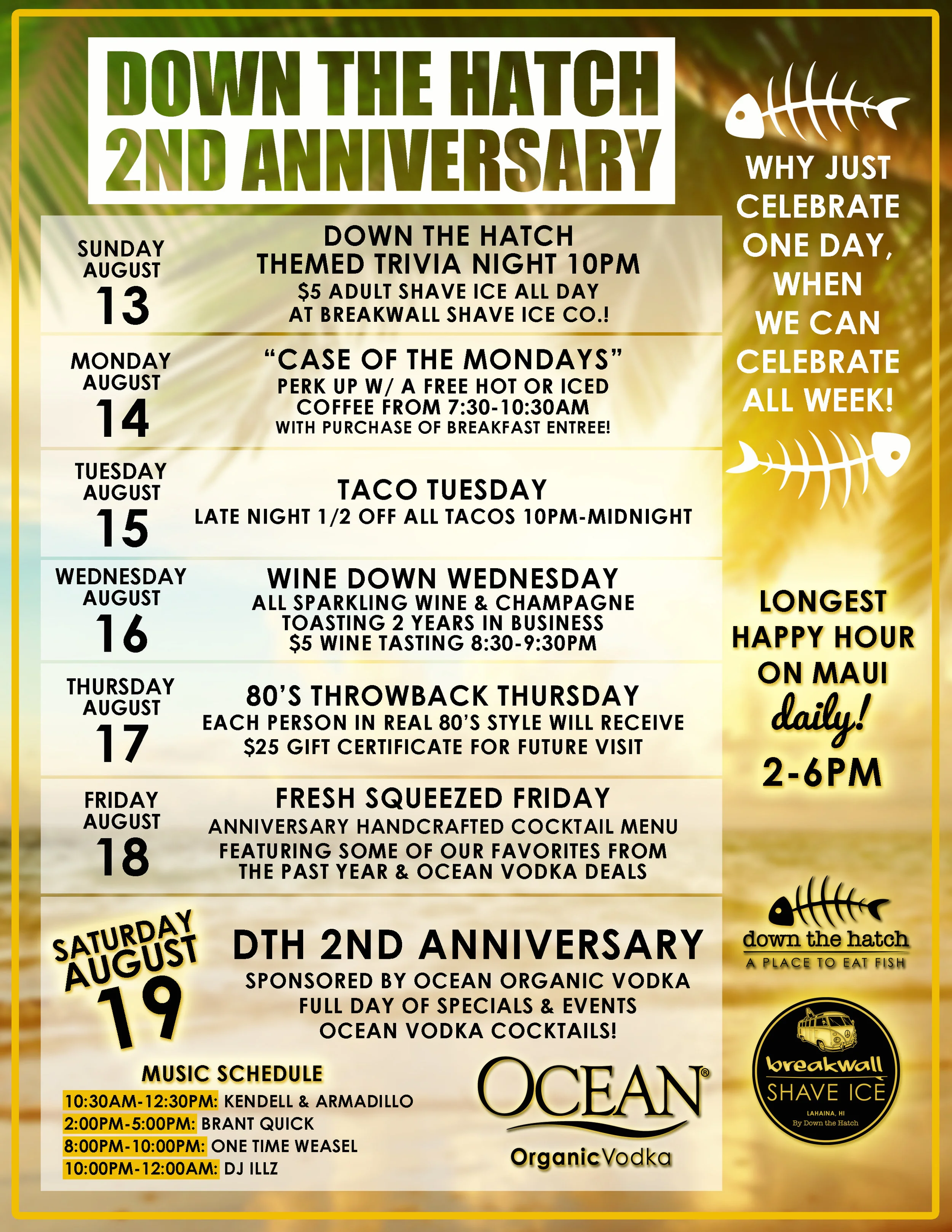 It’s time to celebrate 2 Years of Down the Hatch Maui and we are pulling out all the stops! Why celebrate one day, when we can celebrate the whole week? Our 2nd Anniversary falls on Saturday, August 19th, and looking back we recognize how blessed we are. The last year has been a great second year for Down the Hatch, and we have all our loyal customers and community to thank for it. In honor of that, DTH will be celebrating in a variety of ways ALL WEEK LONG. We’ll be incorporating DTH fun in our already packed entertainment schedule. See what we have in store for everyone below, and we hope to see you at the celebration!