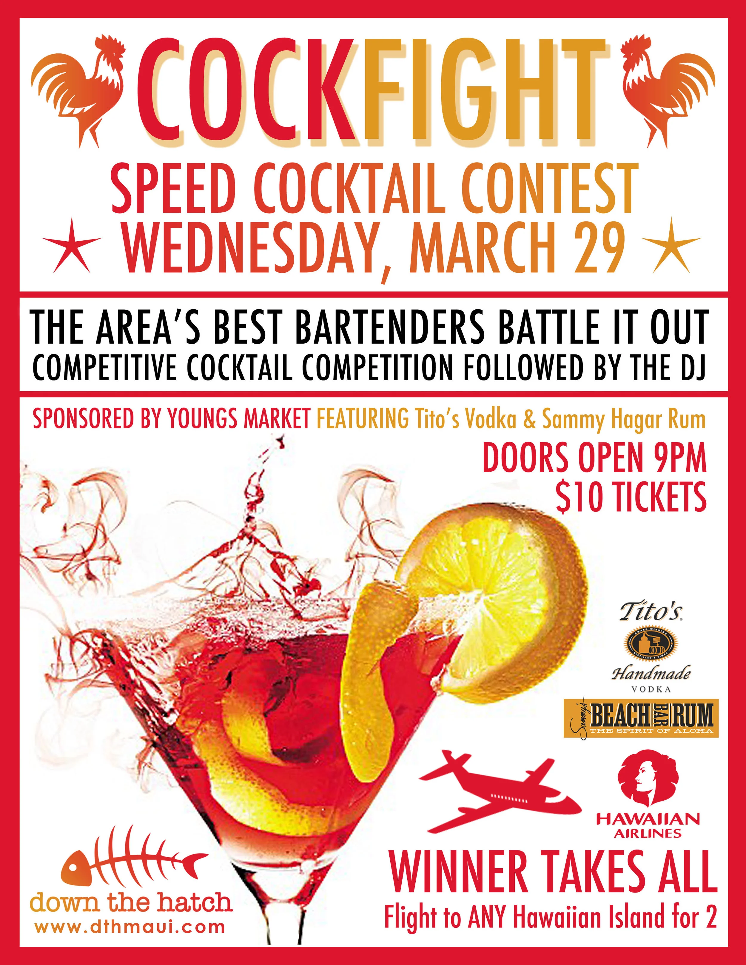 Down the Hatch presents the “COCKFIGHT” Speed Cocktail Contest, Wednesday, March 29th, 2017, featuring some of Maui’s best westside bartenders. Winner takes all! The prize... Two Round Trip Flights to anywhere in the Hawaiian Islands, Down the Hatch “Cock Fight” Belt, and a chance to sit on the judges panel next year or defend the title.