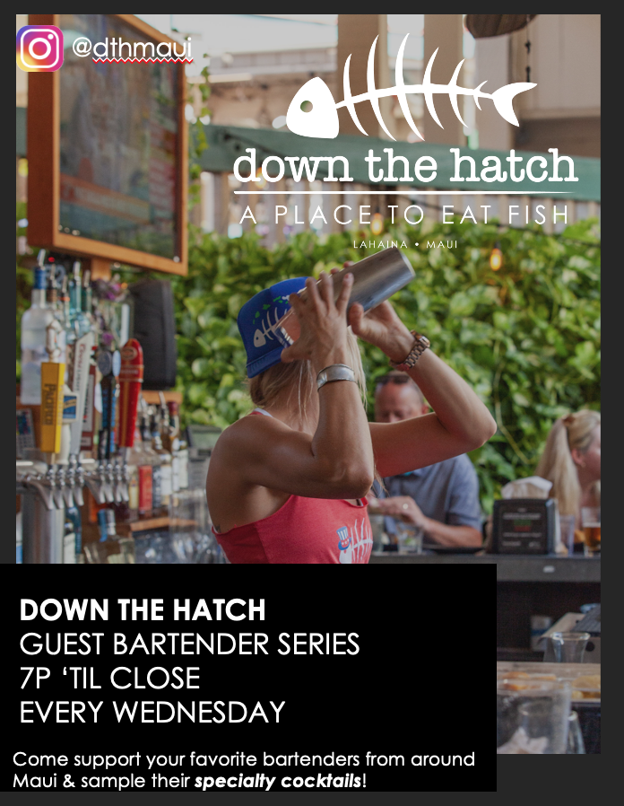 Want to enter the series? Guest Bartenders will feature their own craft cocktails & have a chance to sling drinks, show off their cocktail skills, talk story, & make some cash. Email mike@dthmaui.com to find out more details.
